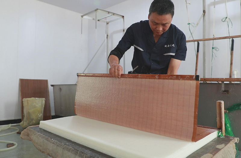 徽州傳統(tǒng)手工楮皮紙,采用傳統(tǒng)手工抄紙工藝,經過27道工序,以手工精細制作而成,產品主要有楮皮紙、云龍紙、皺紋紙、落水紙、棉紙、版畫、攝影畫、手撕畫專用紙。 生產工序: 浸泡—→腳踏—→清水蒸煮—→切料—→石灰漿浸泡—→蒸煮—→自然漂洗—→腳踏