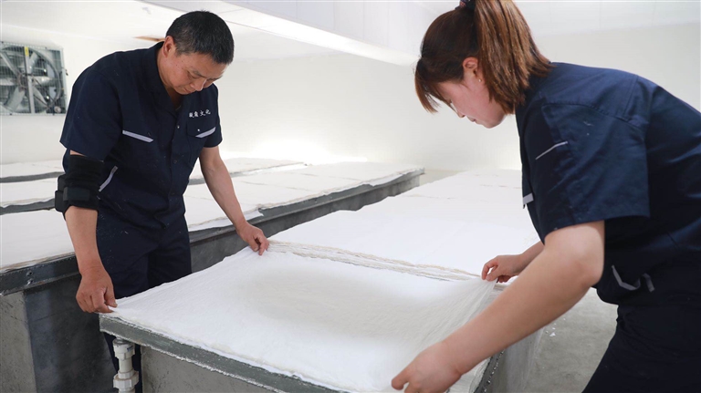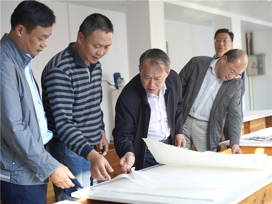 10月9日下午,縣長吳云忠赴海陽鎮(zhèn)凝霜文化發(fā)展公司調研徽州楮皮紙傳承與發(fā)展工作,縣委常委、海陽鎮(zhèn)黨委書記金學年,縣委常委、縣政府副縣長程衛(wèi)華參加調研活動。 吳云忠一行實地察看了徽州楮皮紙生產工藝流程,認真聽取企業(yè)負責人介紹,詳細詢問徽州楮皮紙制作工藝